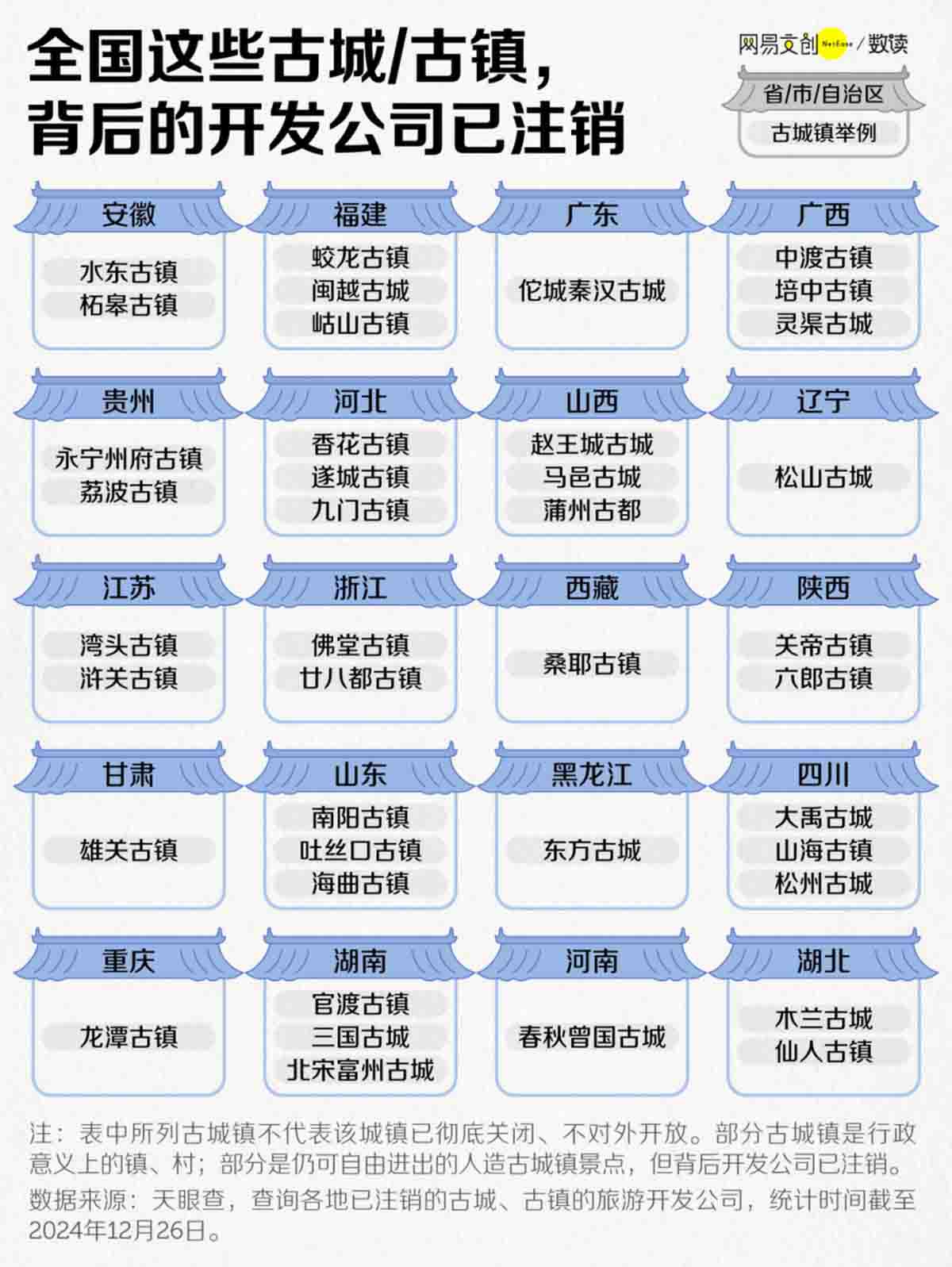 据企业信息查询平台数据,全国27000余家古城镇相关旅游企业中,近33%处于清算、停业、歇业等异常状态。其中古城旅游相关企业异常率高达35.45%,仅河北、安徽、福建等省份就有数十个古镇项目的开发公司注销跑路,从安徽水东古镇、福建蛟龙古镇到重庆龙潭古镇,多地人造古镇沦为空镇或烂尾工程。除了前文提到的湖南大庸古城,还有山东济南宋风古城,占地652亩,投资近40亿元,于2019年开工建设至今未完工,资金链断裂,杂草丛生,也成为典型的重资产闲置案例。